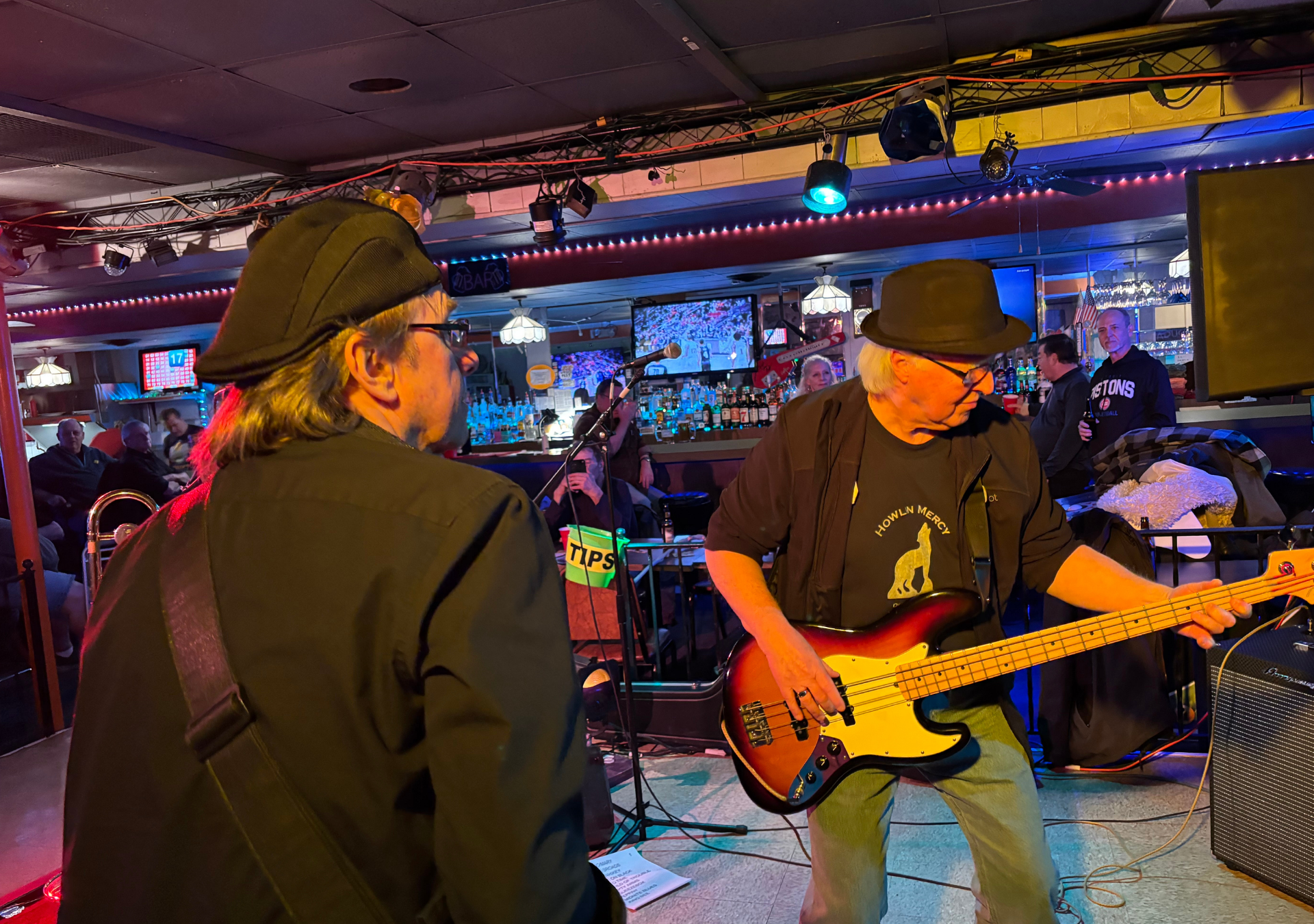 “Andrew wails on blues trombone. Mike flat-out burns on guitar. Matt & Dave hold down the rhythm section. Large house following.”